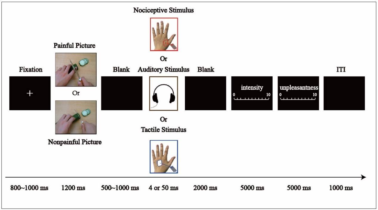 图1.启动范式,包括观看疼痛图片(疼痛共情阶段)和接受感觉刺激(自身感知阶段)