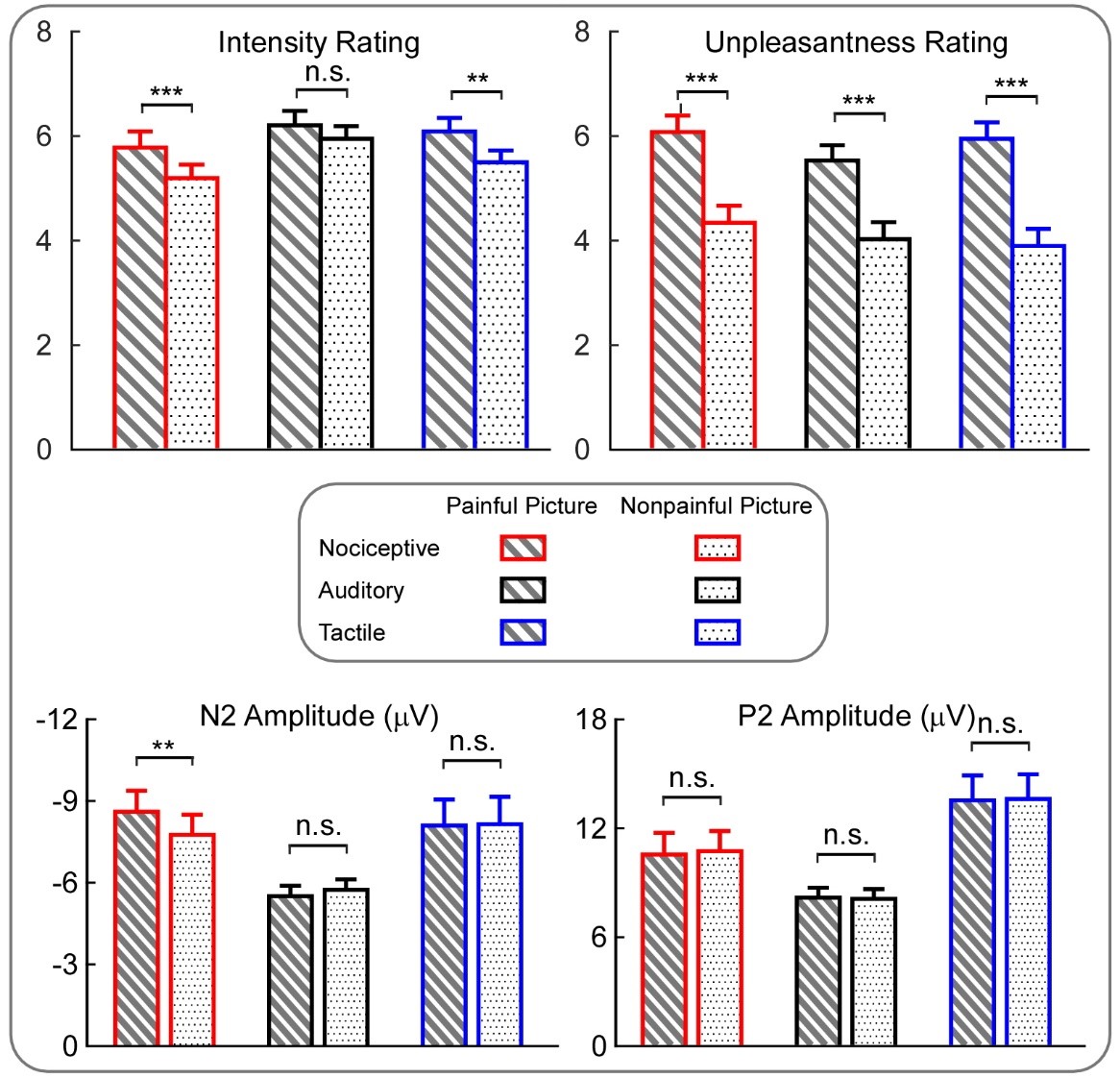 研究结果显示,在行为水平上,相比观看非疼图片,观看疼痛图片后,被试对自身受到的感觉刺激的强度、不愉悦度和唤醒度的评分提高。该结果表明,疼痛共情对自身疼痛、听觉和触觉的主观感知均有增强作用。值得注意的是,被试对他人疼痛的关心程度评分(concern ratings)预测了其对自身受到的伤害性刺激的不愉悦度评分,而被试对他人疼痛的注意吸引程度评分(attention ratings)预测了其对自身受到的听觉或触觉刺激的不愉悦度评分。该结果在一定程度上表明,疼痛共情对自身疼痛感知和非疼痛感知的启动作用涉及不同的心理机制。在脑电生理响应水平上,相比于观看非疼图片,观看疼痛图片后,伤害性刺激诱发了更大幅度的N2成分;而疼痛共情对听觉和触觉刺激诱发的ERP响应无显著影响。该结果同样表明疼痛共情对自身疼痛感知和非疼痛感知具有不同的启动作用。