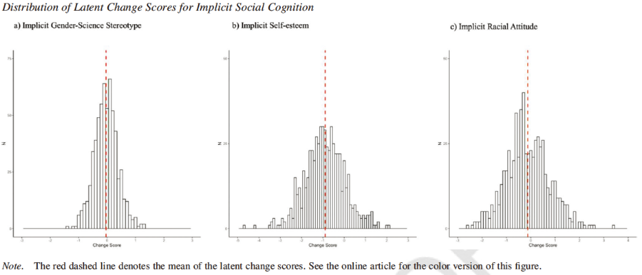 相对稳定性 内隐自尊和内隐种族态度两年内发展的相对稳定性较低 (r < .30),而内隐性别-科学刻板印象发展的相对稳定性较高 (r > .70)。
