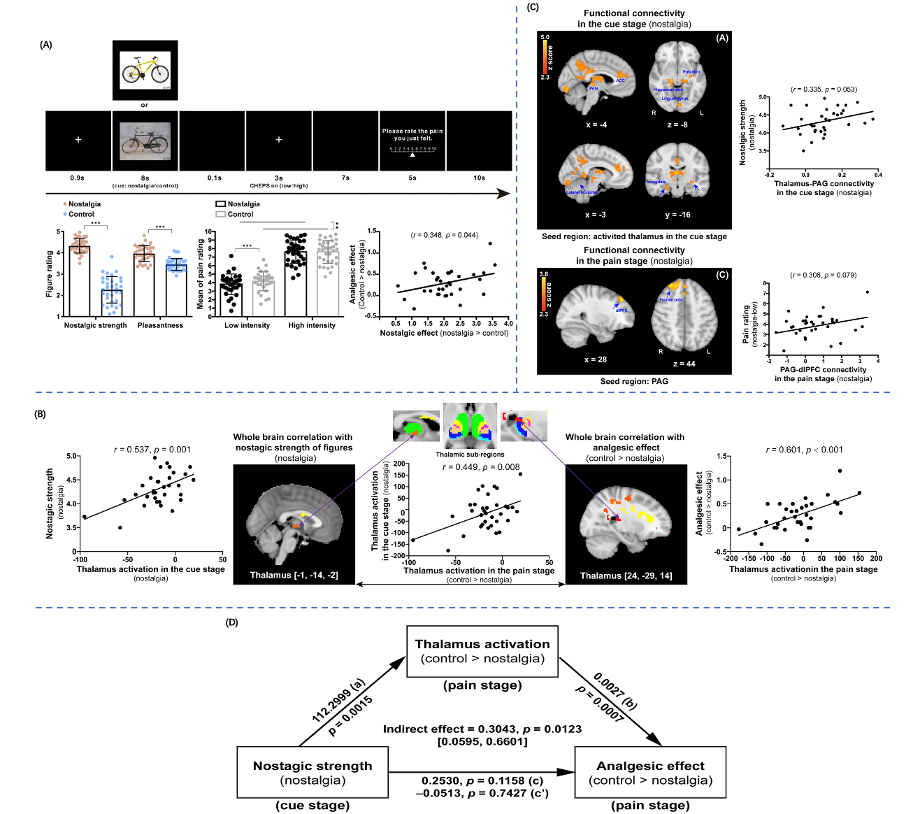 图A:fMRI范式,包括观看怀旧图片(线索阶段)和接受热痛刺激(疼痛阶段);图B:在线索和疼痛阶段,大脑激活与行为评分之间存在显著相关性;图C:PPI分析;图D:中介分析