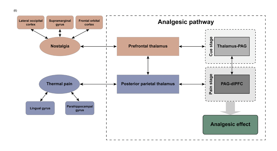 综上所述,研究结果表明,丘脑作为调节疼痛的关键大脑区域,也与怀旧相关的镇痛作用有关(图E)。具体来说,编码怀旧的前丘脑激活可预测编码疼痛的后顶叶丘脑激活。同时,丘脑调节伤害性输入,并在触发脑干镇痛通路中发挥关键作用。这项研究揭示了怀旧镇痛的神经机制,为非药物心理镇痛的进一步发展和改进提供了新的见解。