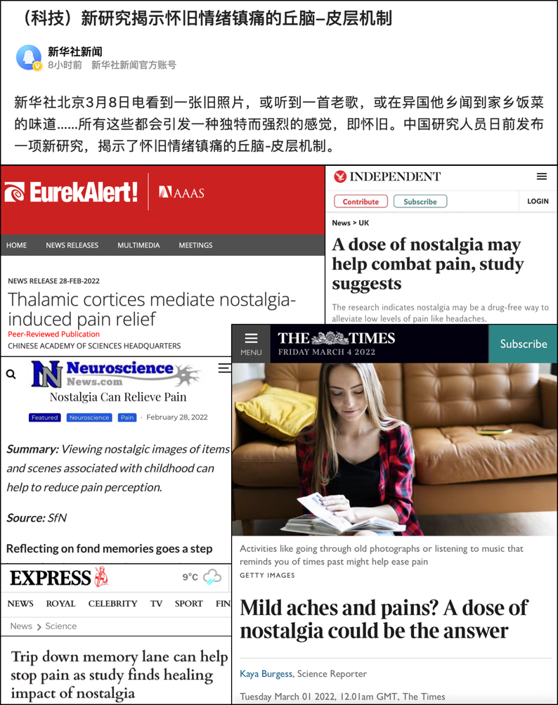 Zhang, M., Yang, Z., Zhong, J., Zhang, Y., Lin, X., Cai, H.*, & Kong. Y*. (2022). Thalamocortical mechanisms for nostalgia-induced analgesia. Journal of Neuroscience.in press. https://doi.org/10.1523/JNEUROSCI.2123-21.2022