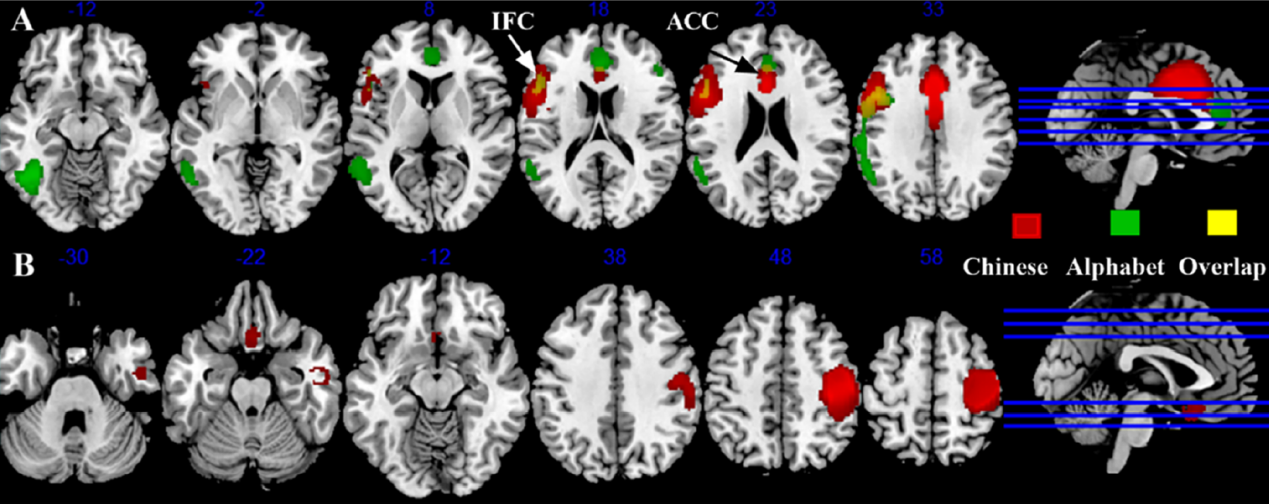 元分析结果发现字母语言和汉语阅读障碍儿童在左侧额下皮层和前扣带回的激活减弱,前扣带回与额下回存在功能连接,且两个脑区均倾向在注意任务中激活,表明不同写作系统阅读障碍儿童存在共同的注意相关的脑功能异常。此外,研究还发现字母语言阅读障碍儿童在左侧枕颞区和顶下小叶的激活减弱;汉语阅读障碍儿童在右侧中央前/后回,右侧颞中回,左侧直回的激活增强。