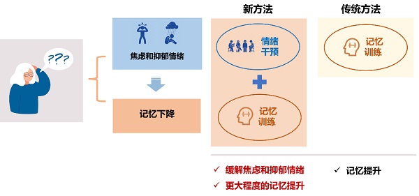 由于焦虑/抑郁情绪和记忆存在密切的关系,缓解焦虑和抑郁情绪可能有助于提升记忆训练的效果。中国科学院心理健康重点实验室李娟研究组创新性地在传统记忆训练中引入对情绪的关注来开展研究,将缓解焦虑和抑郁的情绪干预与经典记忆训练结合,先有针对性地通过团体辅导改善情绪问题,再进行记忆训练,以期产生更好的记忆训练效果(图1)。