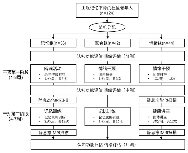 该研究采用双盲临床对照试验设计,选取主观记忆下降(subjective memory complaints)老年人为干预对象。被试被随机分入三个组,分别是情绪-记忆联合训练组、记忆训练组和情绪干预组。三组被试均参加持续7周的干预。第1-3周,联合组和情绪组接受每周一次的团体辅导,记忆组完成阅读任务。第4-7周,联合组和记忆组接受记忆训练,情绪组参加健康教育讲座。所有的被试在干预前、干预中和干预后参加情绪和认知评估(图2)。情绪干预和记忆训练与各自的对照活动在频率、时长和形式上完全匹配。