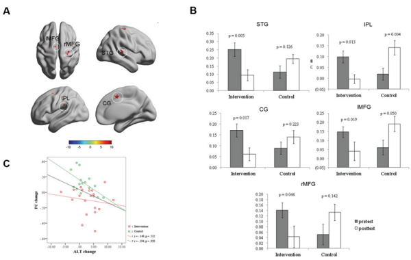 图5. 记忆训练对枕-颞叶功能连接的影响