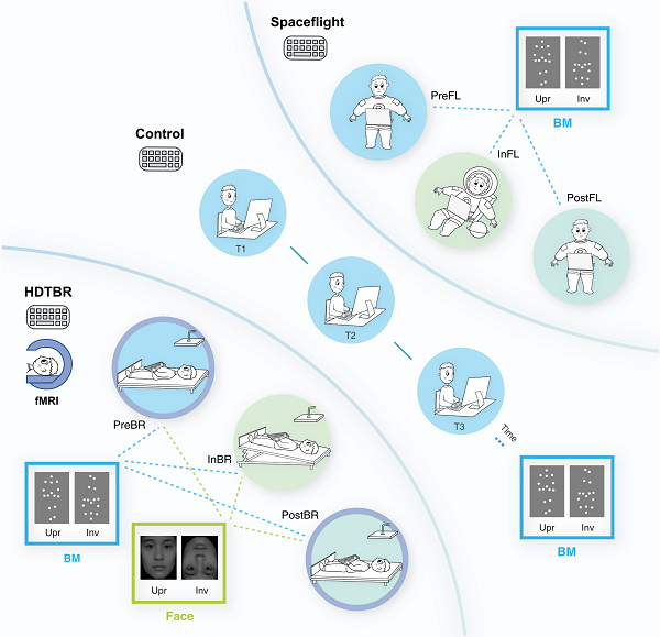为验证航天实验的发现,并探究失重带来的生物运动知觉变化背后的神经机制,研究者开展了一个在地模拟失重实验。实验采用-6°头低位卧床方法模拟航天对人的影响,该方法被证明可以诱发类似于失重状态下的生理及前庭响应改变。45天头低位卧床实验产生了和航天实验类似的行为影响,即生物运动知觉倒置效应在头低位卧床期间逐渐减弱,并最终降至显著低于前测的水平。与此同时,研究者还测量了面孔知觉倒置效应,发现其并不随头低位卧床时间增长而减弱,说明生物运动知觉的改变可能源于运动而非形状信息加工受前庭响应改变的影响。
