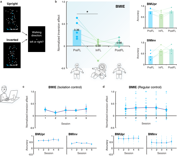 该研究结果支持了后一种假设。首先,通过航天实验,研究者发现暴露于太空失重环境约一周之后,航天员生物运动知觉的倒置效应显著降低,且该效应在个体间具有高度的一致性(图2a,2b),提示地球重力环境对于维持人类对生物运动信息的朝向特异敏感性至关重要。为了进一步检验上述效应是由失重还是其他非重力因素(如航天实验环境和练习效应)引起,研究者开展了两个控制实验。结果发现,在正常地球重力条件下,不论个体是在模拟航天任务的幽闭环境中反复进行生物运动知觉测试,还是在实验室中进行多次测试,都不会表现出生物运动知觉倒置效应的减弱(图2c,2d),从而支持太空失重、而非重力无关因素决定了航天实验的结果。
