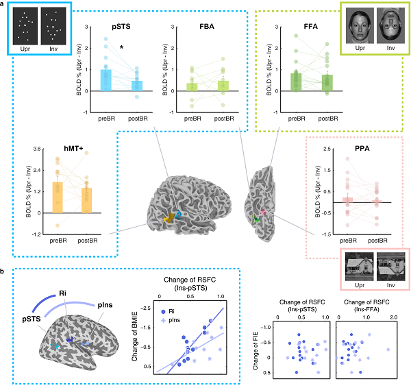 在头低位卧床模拟失重前后,研究者还利用功能磁共振成像技术扫描了受试者的神经活动。在前测中,大脑中特异于生物运动加工的pSTS脑区表现出对生物运动刺激的朝向依赖性响应(神经水平的倒置效应),而该效应在后测中显著下降,且上述改变无法由简单运动或静态身体形状刺激诱发的神经响应所解释(图3a)。作为对照,负责面孔加工的FFA脑区在前测中表现出对面孔刺激的朝向依赖性响应,但该效应在后测中并未发生改变;此外,加工房屋刺激的PPA脑区对正倒立房屋刺激的相对响应强度也未在前后测中表现出差异。这些结果排除了头低位卧床本身改变一般性静态物体表征的可能性,说明模拟失重特异性地改变了生物运动信息的朝向特异性视觉加工。静息态功能连接分析进一步发现,pSTS与脑岛后部区域的功能连接在后测显著增强;更重要的是,该连接增强幅度可预测行为水平生物运动知觉倒置效应的减少幅度(图3b)。后脑岛作为前庭系统的核心脑区,已被发现与前庭和视觉重力信息加工及内部重力模型的存储有关,因而上述结果有力支持了前庭重力计算参与视觉生物运动信息朝向特异性加工的假说。
