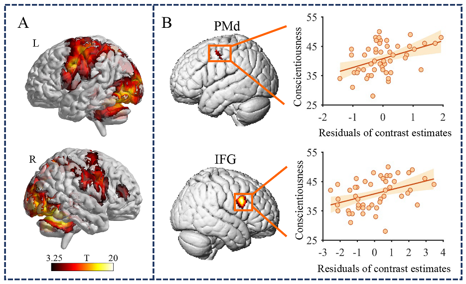 为探究汉字书写与人格之间的内在联系,中国科学院行为科学重点实验室毕鸿燕研究组开展了一项合作研究。与传统的静态笔迹分析不同,本研究采用功能磁共振技术,全面记录了书写动态过程的脑活动,并采用大五人格测验测量人格特征。研究发现,在群组水平上,人格的尽责性(conscientiousness)水平与书写过程中左侧运动前区与右侧额下回的激活水平呈显著正相关(图1),提示人格特质调控书写中的视觉-运动转换与执行控制加工。为进一步明确这种相关的特异性,研究者进一步考察了人格特质与画图和文字识别两个控制任务脑激活的相关,发现人格与这两个任务脑激活没有显著相关,这表明人格尽责性与书写脑活动之间的相关具有领域特异性。