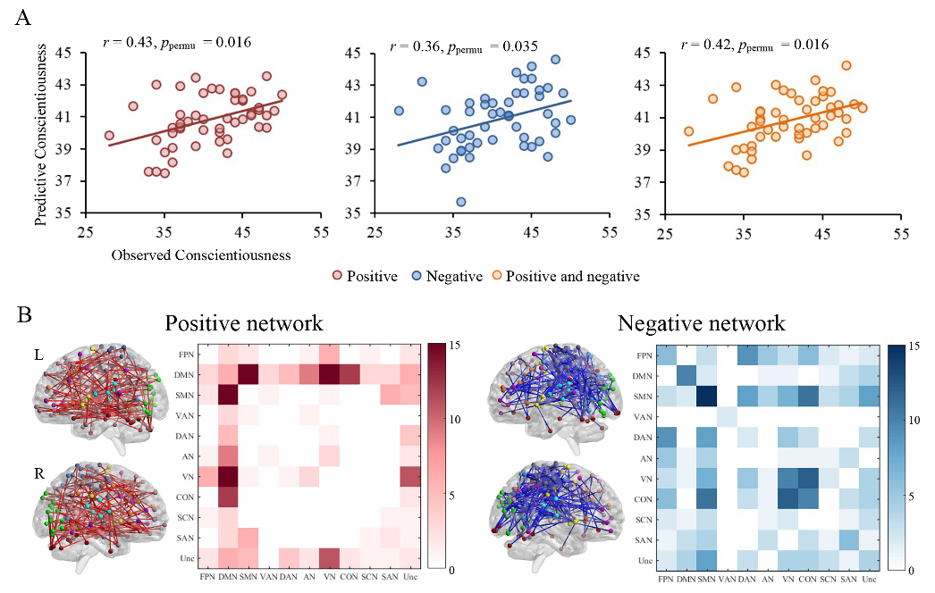 (A)基于书写脑网络预测的尽责性分数与人格量表实际测量的分数的相关散点图;(B)预测人格的书写脑网络连接模式