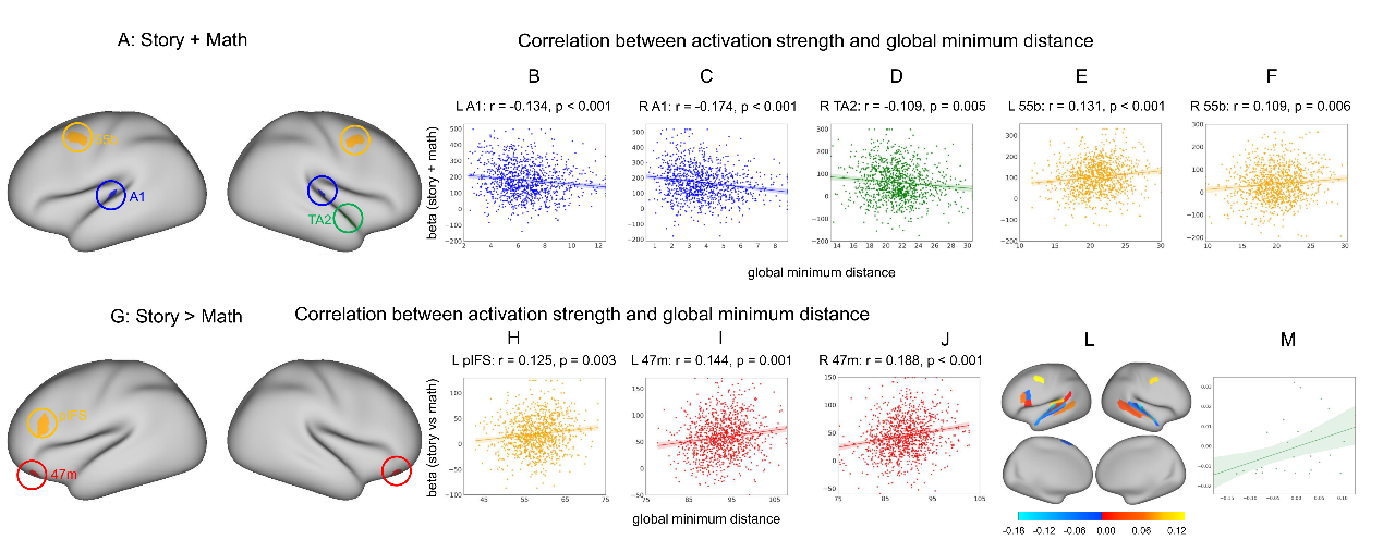 A~F是在语言和数学任务均有激活的脑区中其激活强度和整体最短距离有相关的脑区。属于听觉网络的脑区(蓝色和绿色)的激活强度和整体最短距离有负相关;属于语言网络的脑区(黄色)有正相关