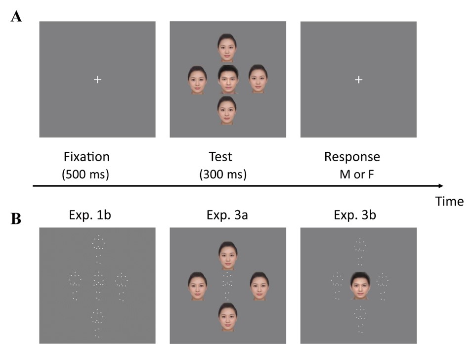 人们对于视觉刺激的知觉加工高度依赖于其所处情境。一条灰色长裙,当它挂在黑色长裙旁边时,看起来更接近白色;但当它挂在白色长裙旁边时,却显得更接近黑色。这反映了空间情境对视知觉的影响,表现出同时对比效应。除颜色外,同时对比效应已被证实广泛存在于线条朝向、运动方向等低级视觉特征的加工中。与此相对,视觉刺激所处的时间情境同样会改变人们的知觉。适应后效就是一种被广泛探究的时间情境效应。但与同时对比效应不同的是,适应后效不仅存在于低级视觉特征,也存在于高级视觉特征的处理中,包括面孔情绪与性别等。例如,长时间观看一张女性面孔会使得人们更倾向于对随后呈现的性别信息较为模糊的面孔知觉为男性。已有大量研究借助于低级视觉特征加工,揭示同时对比和适应后效在行为表现与认知机制上具有相似性。那么,类比适应后效,同时对比效应是否也存在于高级视觉特征的知觉加工?如果存在,基于高级视觉特征的同时对比效应又具有哪些特征?