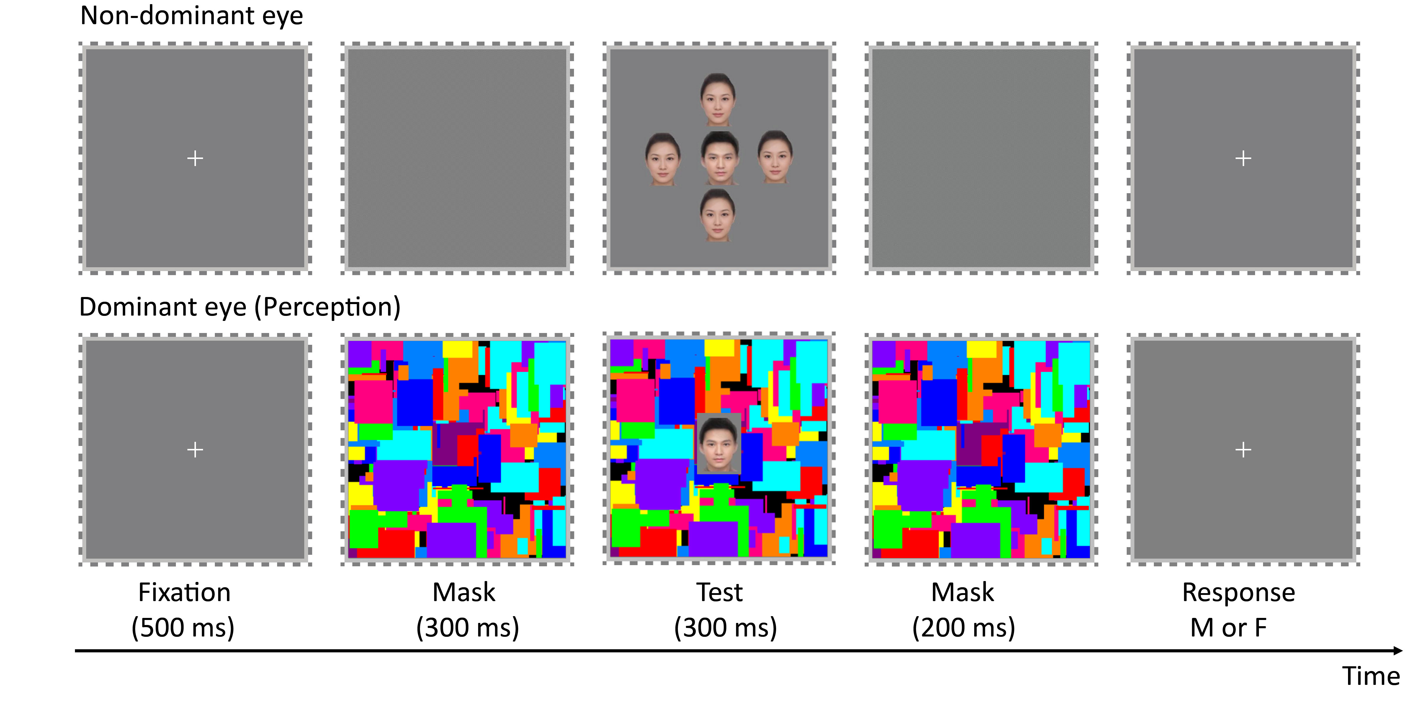 不同于低级视觉特征,性别作为一种高级视觉特征,存在于多类刺激中。为了进一步探究性别同时对比效应能否跨类别发生,研究者在实验3中通过呈现不同种类的情境和测试刺激(图1B Exp.3a 和图1B Exp.3b),发现性别同时对比效应不能在面孔和生物运动之间跨类别发生。实验4则借助持续闪烁抑制范式(图3),发现当周围情境刺激不可见时,也不存在性别同时对比效应。这提示性别同时对比效应可能依赖于对情境刺激的意识,不同于低水平视觉特征的同时对比效应(不依赖情境刺激能否通达意识)。