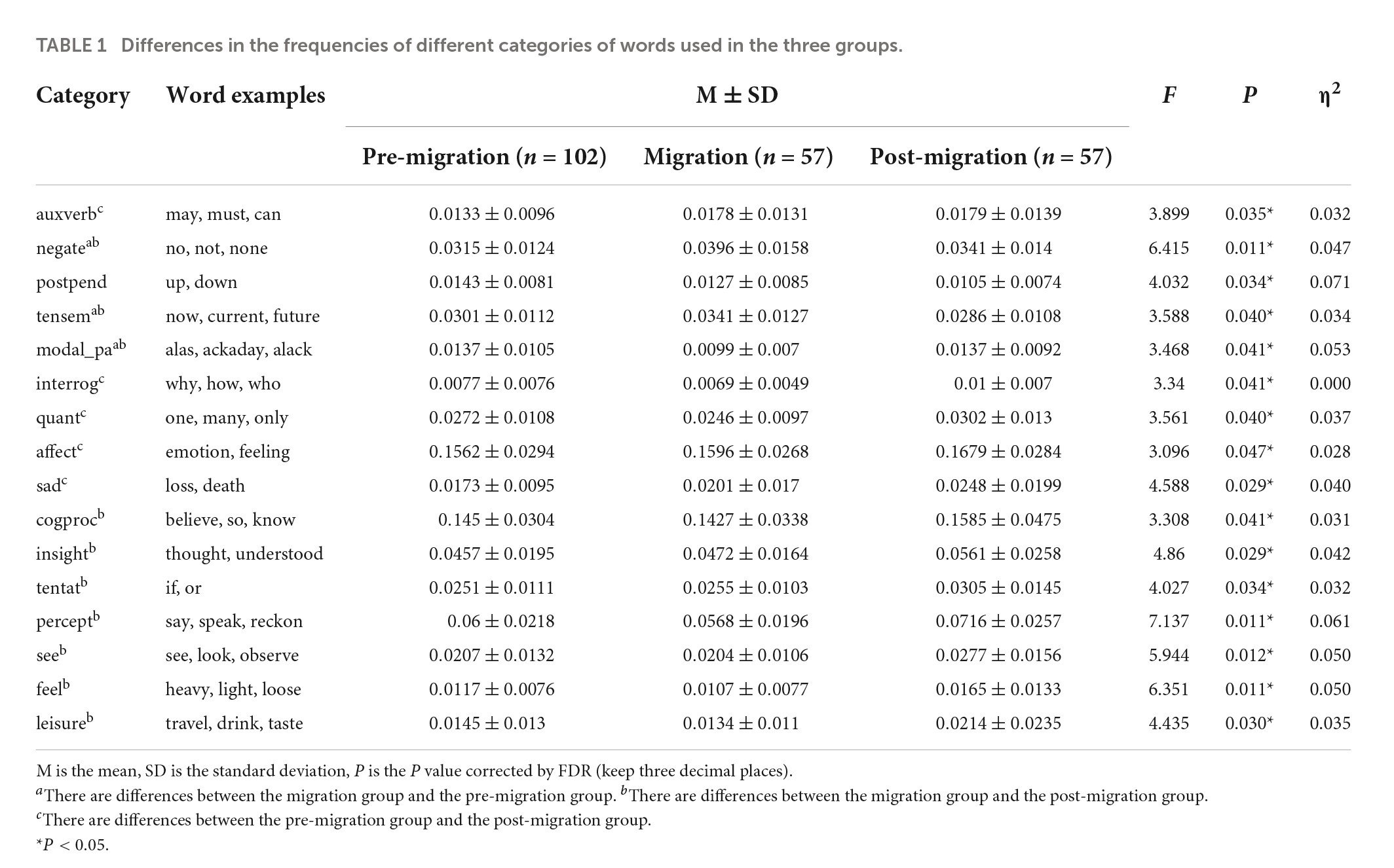 结果显示,南渡组士人有三个词类(时态词、否定词、语气助词)同时与南渡前和南渡后士人组的心理语义存在显著性差异,这被认为是南渡带来的直接影响的反映。另有七个词类(认知过程词、洞察词、犹豫词、感知过程词、视觉词、感觉词、娱乐词)仅与南渡后士人存在显著性差异(表1)。南渡后组的士人都是南渡士人的后代,对此,这被认为这是南渡带来的间接影响。结合这些词类的心理语义研究和相关历史研究,分析了南渡对士人群体心理的影响。