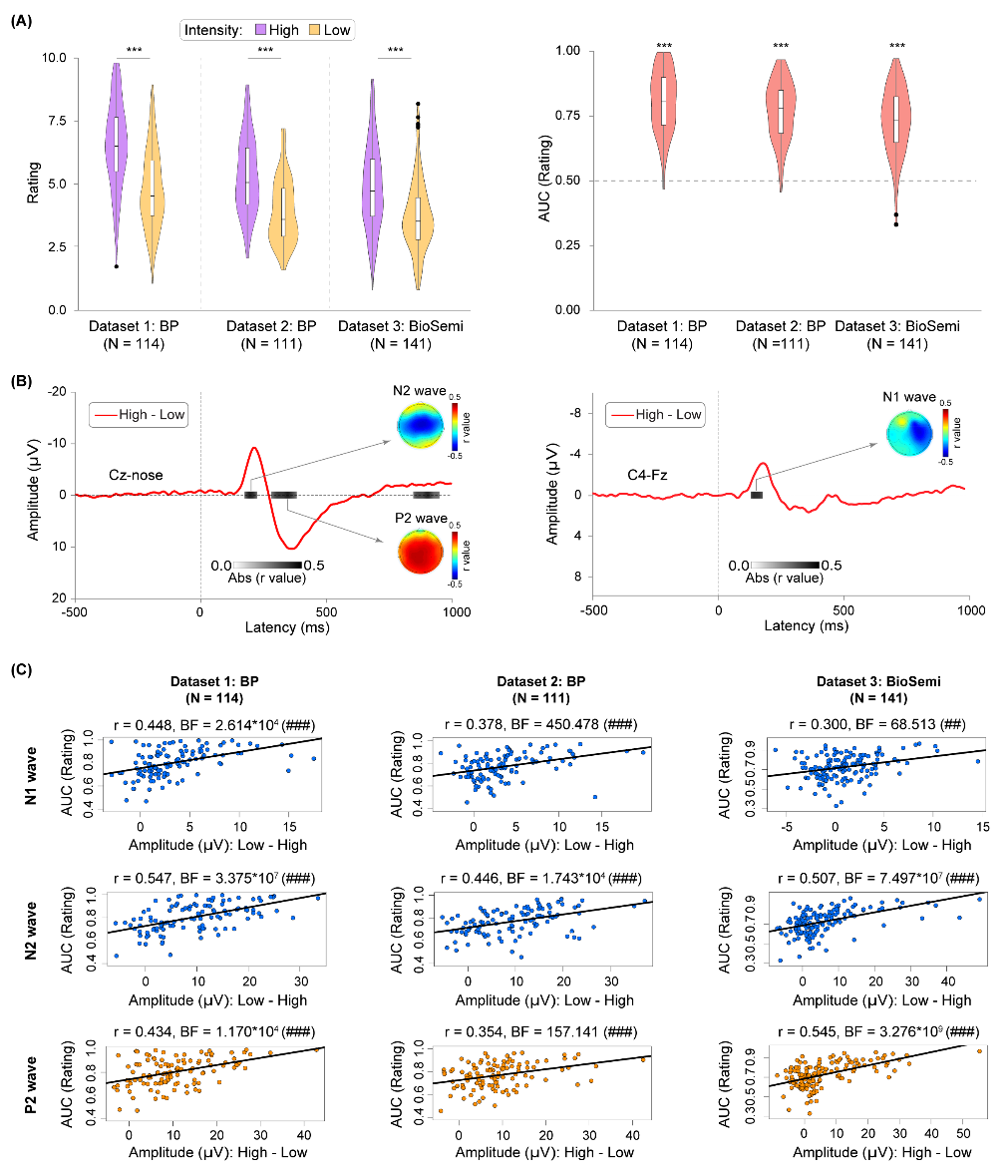 为了解决这一问题,胡理研究组创造性地将疼痛敏感性区分为绝对敏感性和差异敏感性这两个独立的概念。绝对疼痛敏感性刻画了个体对相同疼痛刺激感知的差异,而差异疼痛敏感性(或称为疼痛分辨力)则代表了个体区分不同疼痛刺激的能力。已有研究通常只探究了疼痛诱发脑响应和绝对疼痛敏感性的关系,而忽视了哪些神经响应能够反映差异疼痛敏感性——即便已有研究证实了差异疼痛敏感性和慢性疼痛有着密切关联[3,4]。为弥补这一不足,胡理研究组开展了一项脑电研究和一项功能磁共振成像研究,利用信号检测论量化了感觉分辨力,考察了哪些神经指标反映了疼痛分辨力,并在五个大数据集中检验了这些神经指标的可重复性和疼痛特异性。