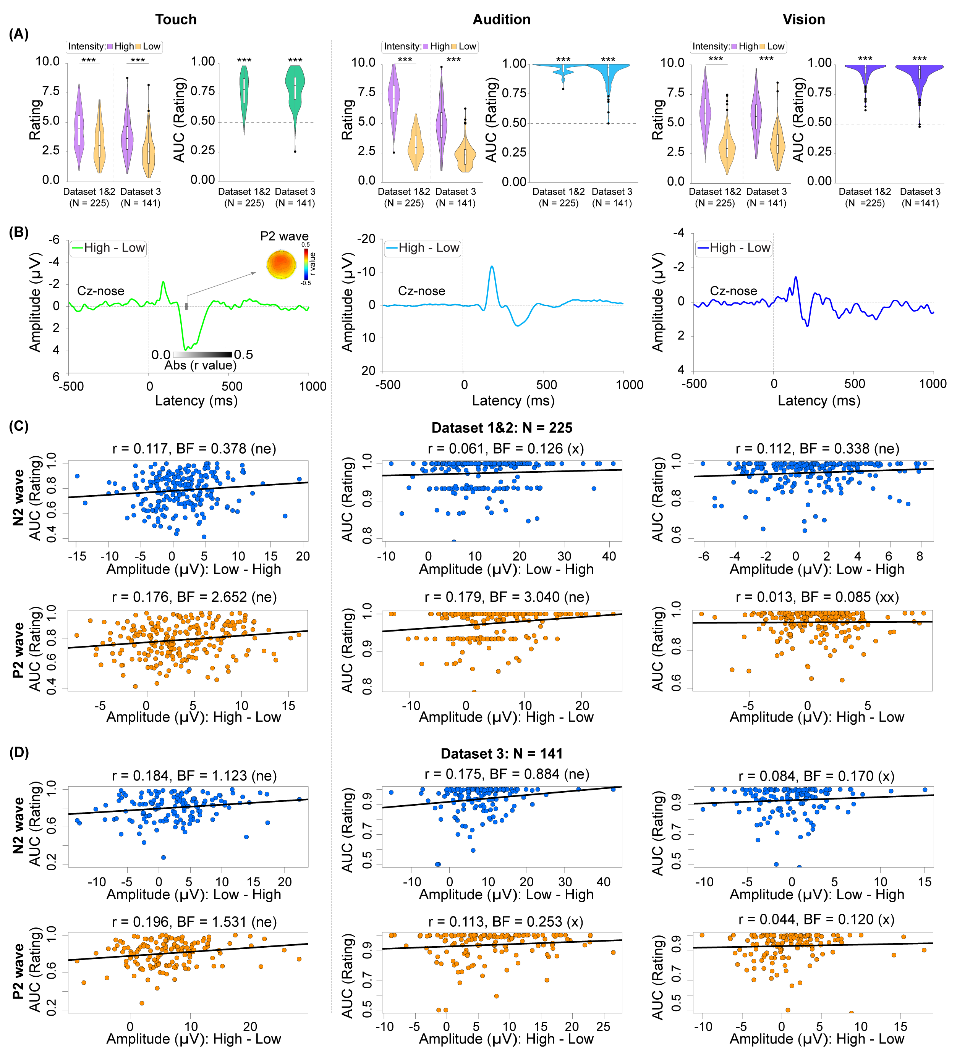 脑电研究纳入了三个大数据集(数据集1~3,总N=366)。每个数据集都采用了相同的实验任务:给被试施加痛觉、触觉、听觉和视觉四种感觉模态的刺激,每种感觉模态均有高、低两种强度,最后要求被试对刺激做出0~10的主观强度评分。结果显示,在数据集1中,高、低强度疼痛刺激诱发的N1、N2和P2幅值差异(高-低)与基于信号检测论的疼痛分辨力指标(AUC)存在显著相关(图1)。这一发现在数据集2和3中得到了很好的重复。另一方面,高、低强度下的幅值差异(高-低)却与相应的触觉、听觉、视觉分辨力不存在稳定的相关关系(图2)。深入分析排除了可能的混淆因素:换用不同的分辨力指标(AUC、d′、高低刺激强度下的评分差异)、匹配不同模态间的主观评分差异、匹配不同模态的AUC指标均不改变主要结果,依然只有疼痛模态下的脑电响应与分辨力有稳定的相关关系。