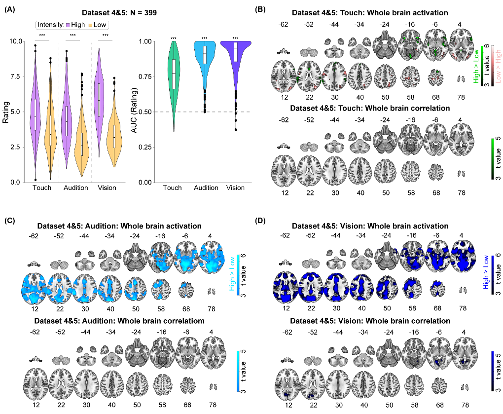 功能磁共振成像研究得到了和脑电研究一致的结果。该研究包含两个大数据集(数据集4和5,总N = 399),实验任务也是要求被试对不同模态、强度的感觉刺激做出主观评分。对数据集4的分析结果显示,初级体感皮层、次级体感皮层、脑岛、前扣带回、丘脑等一系列脑区在高、低强度下的激活差异(高-低)与疼痛分辨力存在显著相关(图3)。这一结果也在数据集5中得到重复。然而,与疼痛模态不同,触觉、听觉和视觉模态下几乎没有体素与相应的分辨力有相关关系(图4)。换用不同的分辨力指标和匹配不同模态间的主观评分依然得到了一致的结果。可见,疼痛刺激诱发的脑区激活可特异地反映疼痛分辨力。