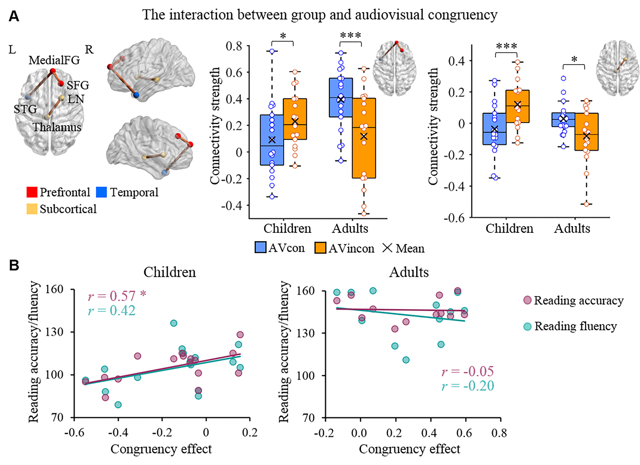 结果发现,儿童视听一致条件下脑网络的全局效率低于成人,且儿童中脑网络的全局效率与阅读准确性和阅读流畅性相关,表明视听整合脑网络全局效率的提高有助于阅读的发展。儿童与成人视听整合脑网络的差异主要表现在一个前额叶-颞上回网络上(图1)。该网络的连接强度在成人中表现为显著的一致性效应(视听一致>视听不一致),而在儿童中则表现为显著的不一致性效应(视听不一致>视听一致),体现了前额叶皮层涉及的注意控制功能对左侧颞上皮层视听整合加工的调控作用的发展。在儿童中,前额叶-颞上回网络连接强度的一致性效应与阅读准确性显著相关,反应了这个视听整合脑网络的发展对阅读能力提升的作用。