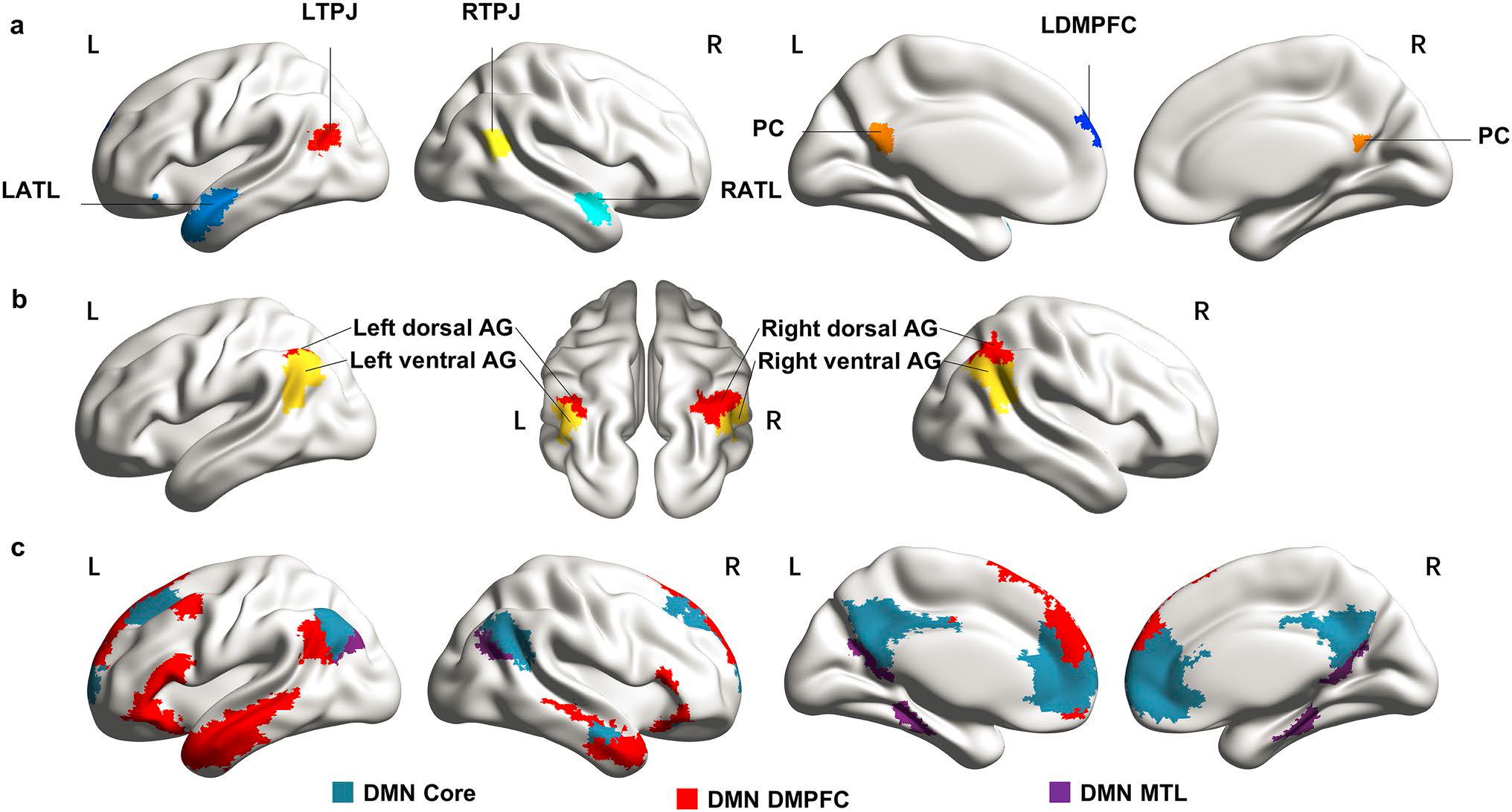 图1.感兴趣区。a 社会语义加工脑网络;b 背侧和腹侧角回;c 默认网络的3个子网络