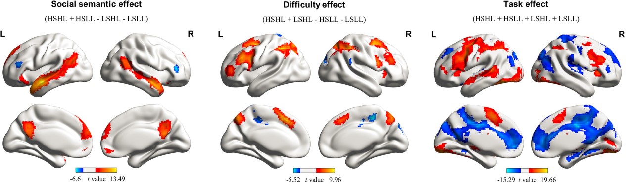 第一,社会语义加工脑网络内的所有脑区都同时存在语义社会性和任务难度的主效应,表现为在加工高社会性故事、以及任务难度较低时激活更强,但不存在两者间的交互作用。这提示社会语义加工脑网络内的所有脑区都同时具备以往不同研究所分别提示的社会语义功能和非语义功能。