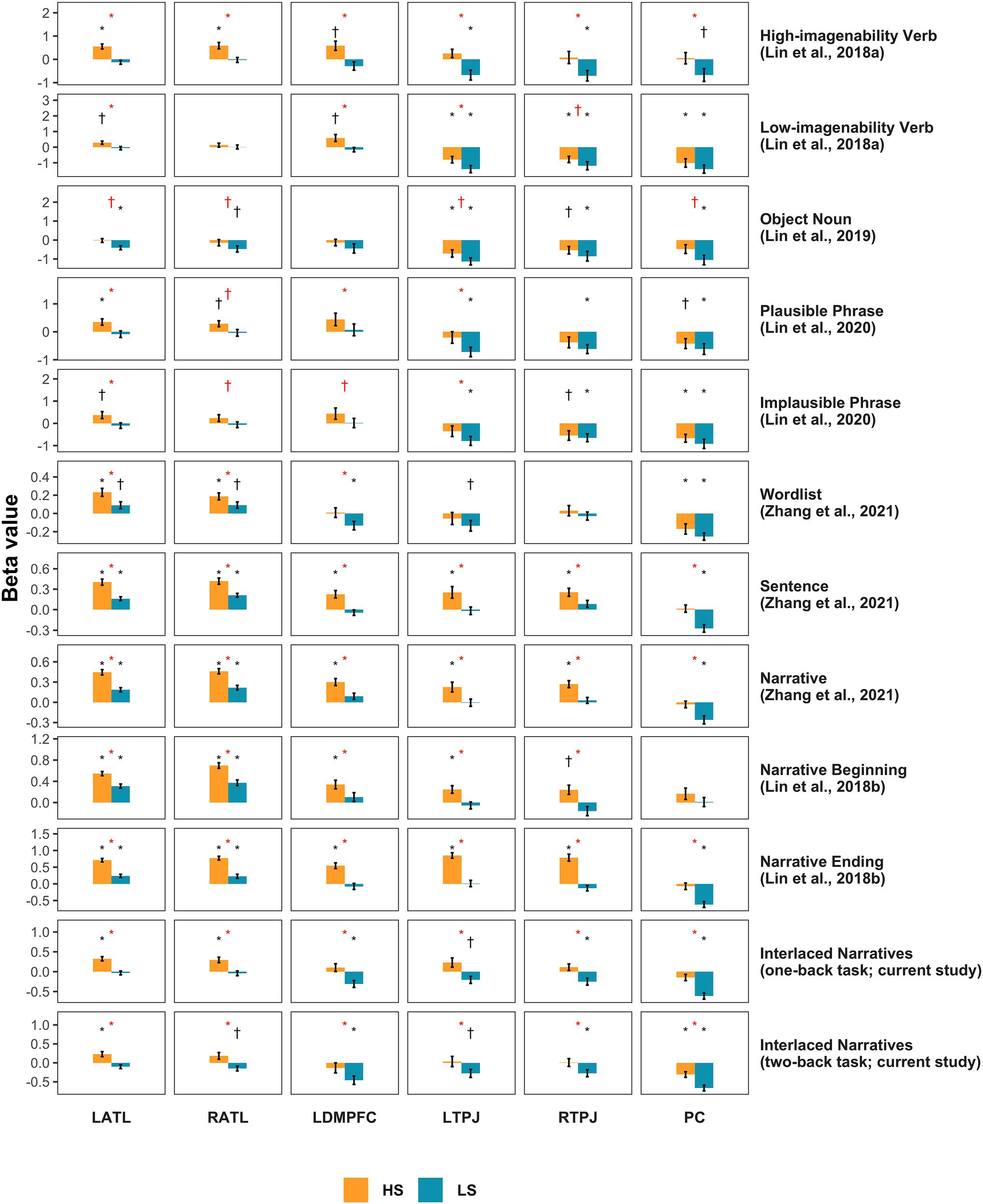 图3.社会语义效应和任务效应的跨研究比较。图中HS和LS分别代表高社会和低社会条件。LATL、RATL、LDMPFC、LTPJ、RTPJ、PC分别为社会语义网络的6个脑区