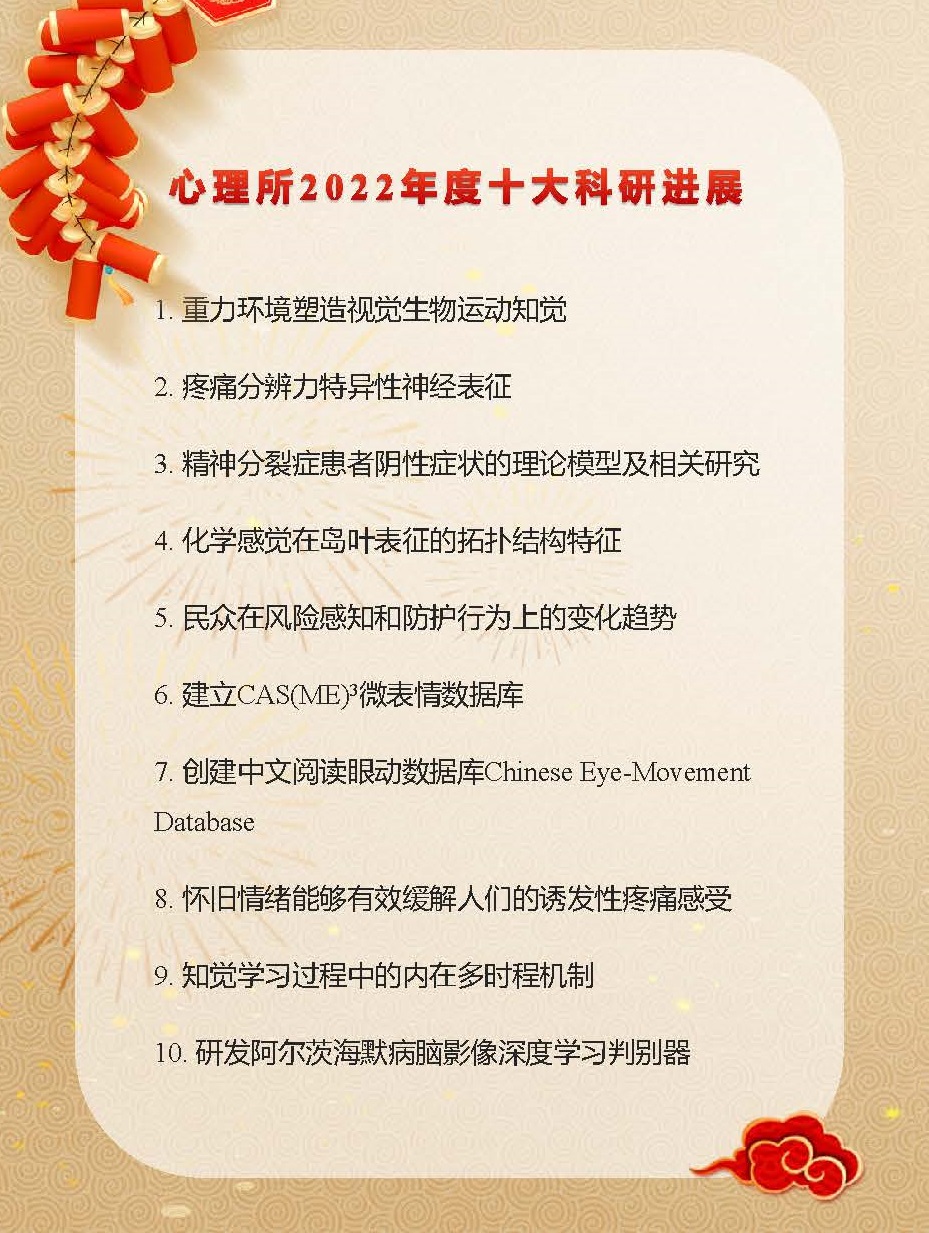 2022年,心理研究所面向国家重大需求,潜心科研,硕果累累。近期,研究所围绕使命导向的研究所评价体系,进一步突出科研进展,充分发挥实验室的学术评价功能开展遴选,全所师生参与票选,根据得票高低,现评选出心理所2022年度十大科研进展: