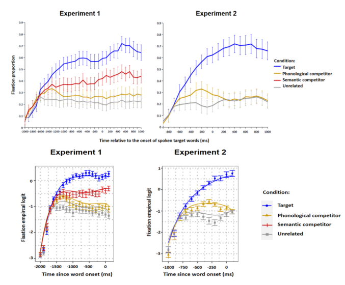 上图:实验一、实验二实验条件下注视比例图。蓝色线表示目标物条件,黄色线表示语音相关项条件,红色线表示语义相关项条件,灰色线表示无关物条件,横轴表示预测目标词呈现时间(时间0代表预测目标词开始呈现),纵轴表示注视比例,误差线表示标准误;