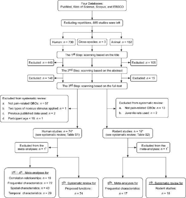 为了解决这一问题,胡理研究组开展了一项系统综述和元分析:汇总现有研究,探究GBOs异质性的来源,刻画了GBOs与疼痛强度的相关关系、频率、空间和时间特征,并总结了不同类型GBOs的功能意义。具体来说,研究内容包括人类研究和动物研究两个部分,在四个数据库(PubMed、Web of Science、Scopus和EBSCO)进行了疼痛相关GBOs的文献检索,并进行了严格的文章筛选,最终纳入了74篇人类研究和18篇动物研究,针对各自的文献情况分别进行元分析和系统综述(图1)。