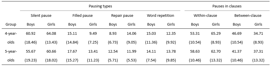 研究发现,4-5岁儿童叙事中的总停顿频率表现出显著的年龄和性别差异。5岁儿童叙事中的停顿明显少于4岁儿童,男孩叙事中的停顿明显多于女孩。这反映出学前儿童的言语计划和产生能力随年龄增长而提高,也反映出言语流畅性方面的性别差异可能在发展早期就已显现。