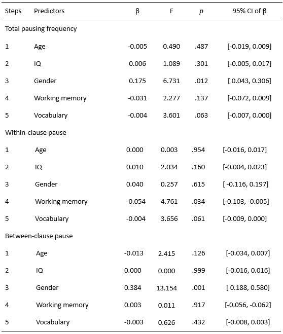 此外,研究还发现,4-5岁儿童叙事中的总停顿频率与其工作记忆和词汇知识呈显著负相关。儿童的工作记忆容量越大,词汇知识越丰富,他们在叙事中出现的停顿就越少。类泊松回归分析结果显示,儿童的工作记忆能显著预测叙事中的句内停顿(表2),表明儿童有限的认知加工资源会影响他们叙事言语中停顿的位置。