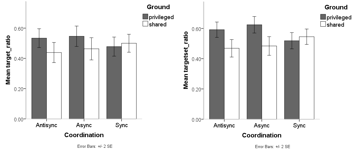 两图均显示,错位同步组和非同步组的儿童在独有视角情境和共同视角情境中表现出显著差异,而同步组的儿童则未表现出差异。这说明错位同步组和非同步组的儿童在独有视角情境下能有效利用视角信息提前锁定目标,而同步组的儿童则未利用视角信息。