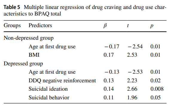 研究结果显示,61%的男性甲基苯丙胺成瘾者报告伴有抑郁症状(374/613)。伴有抑郁症状的成瘾者具有更强的药物渴求和个体攻击性,以及更多的自杀意念和自杀行为史。在伴发抑郁症状的成瘾者中,DDQ用药渴求与BPAQ言语攻击性和敌意呈正相关;在无伴发抑郁症状的成瘾者中,DDQ用药渴求与自我攻击性呈正相关。进一步多元回归分析发现,在伴抑郁症状的成瘾者中,DDQ负强化维度以及自杀史是患者攻击性增加的独立相关因素。