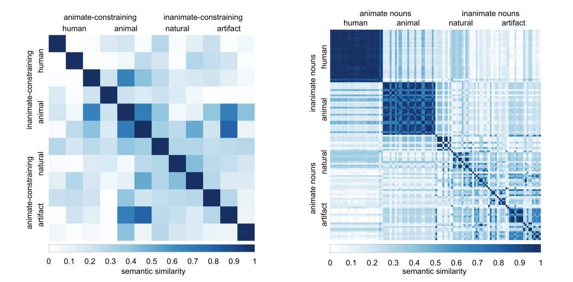 图1. 量词(A)与名词(B)的语义相似性矩阵