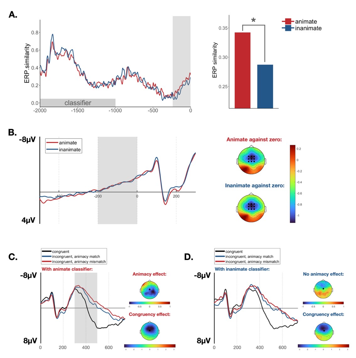 图2. 表征相似度分析与事件相关电位分析结果。A.表征相似性分析显示名词呈现前240毫秒开始出现名词生命性的神经表征相似度效应 B.事件相关电位分析显示名词呈现前开始出现预测波(prediction potential)C和D.量词-名词的不一致搭配引发N400效应