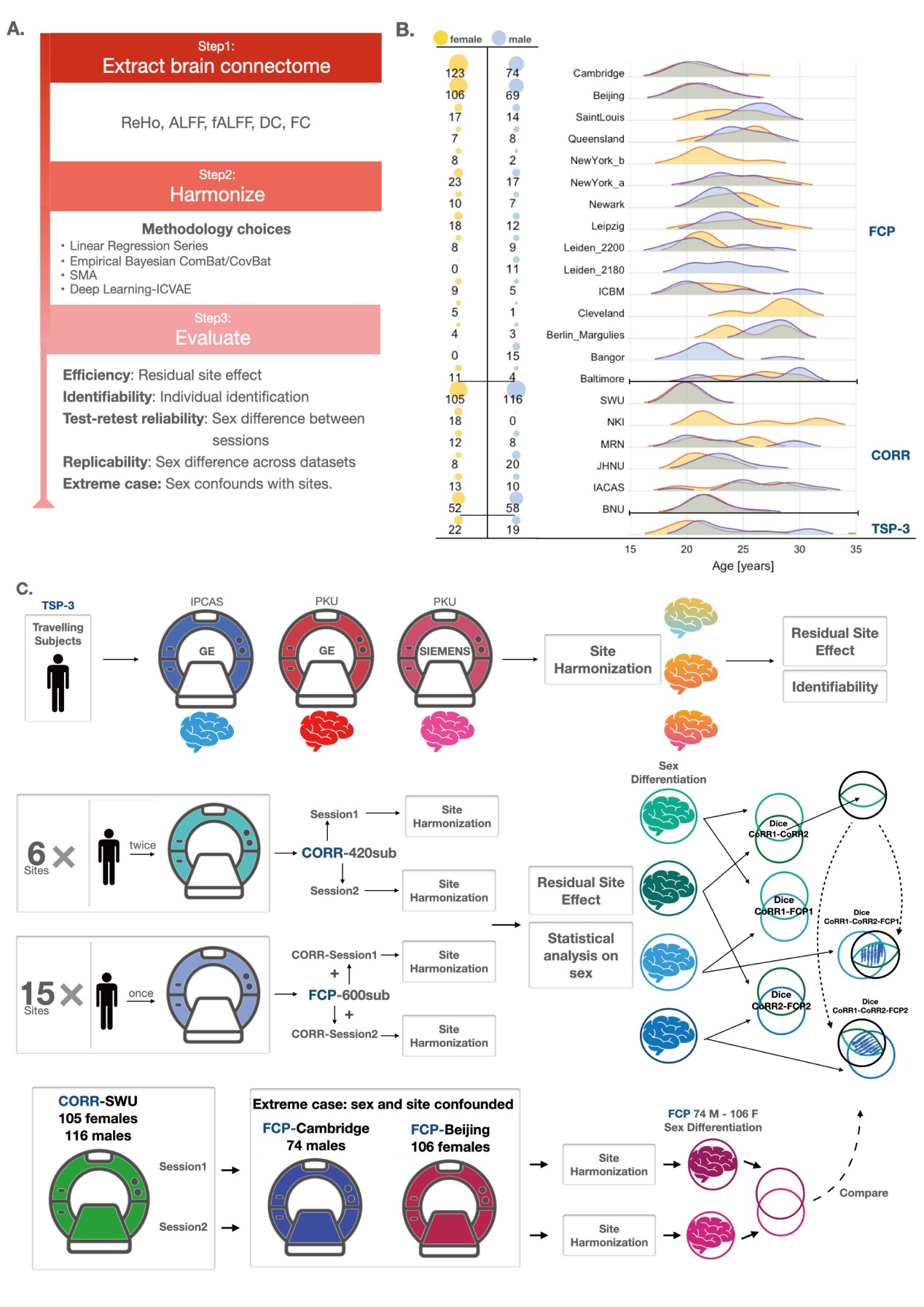 (A) 评价框架。研究者从三个数据集——TSP-3、CoRR 和 FCP(步骤 1)中提取了五个广泛使用的 R-fMRI 指标。然后分别用 11 种方法去除它们的站点效应(步骤 2)。研究者从五个角度评估这些方法:残留站点效应(均值、方差和协方差)、个体可识别性、重测可靠性、可复制性以及站点和性别完全混淆的极端情况(步骤 3)。 (B) 这项工作中使用的数据集的人口统计信息。这包括数据集和站点名称、年龄分布以及每个站点的女性和男性数量。 (C) 详细评估过程。每个数据集都对残留站点效应进行检测。对在三个站点旅行的 41 名受试者进行了个体层面的鉴定。研究者使用分层聚类对 123 张图像进行聚类,通过聚类正确率评估属于每个被试的 3 张图像在校正后是否可以正确地分组在一起(第一行)。性别(男性与女性)的组水平统计分析:重复扫描 CoRR(重测信度,第二行)和 CoRR 和 FCP(可复制性,第三行)之间的Dice系数,以及站点和性别完全混淆(第四行)