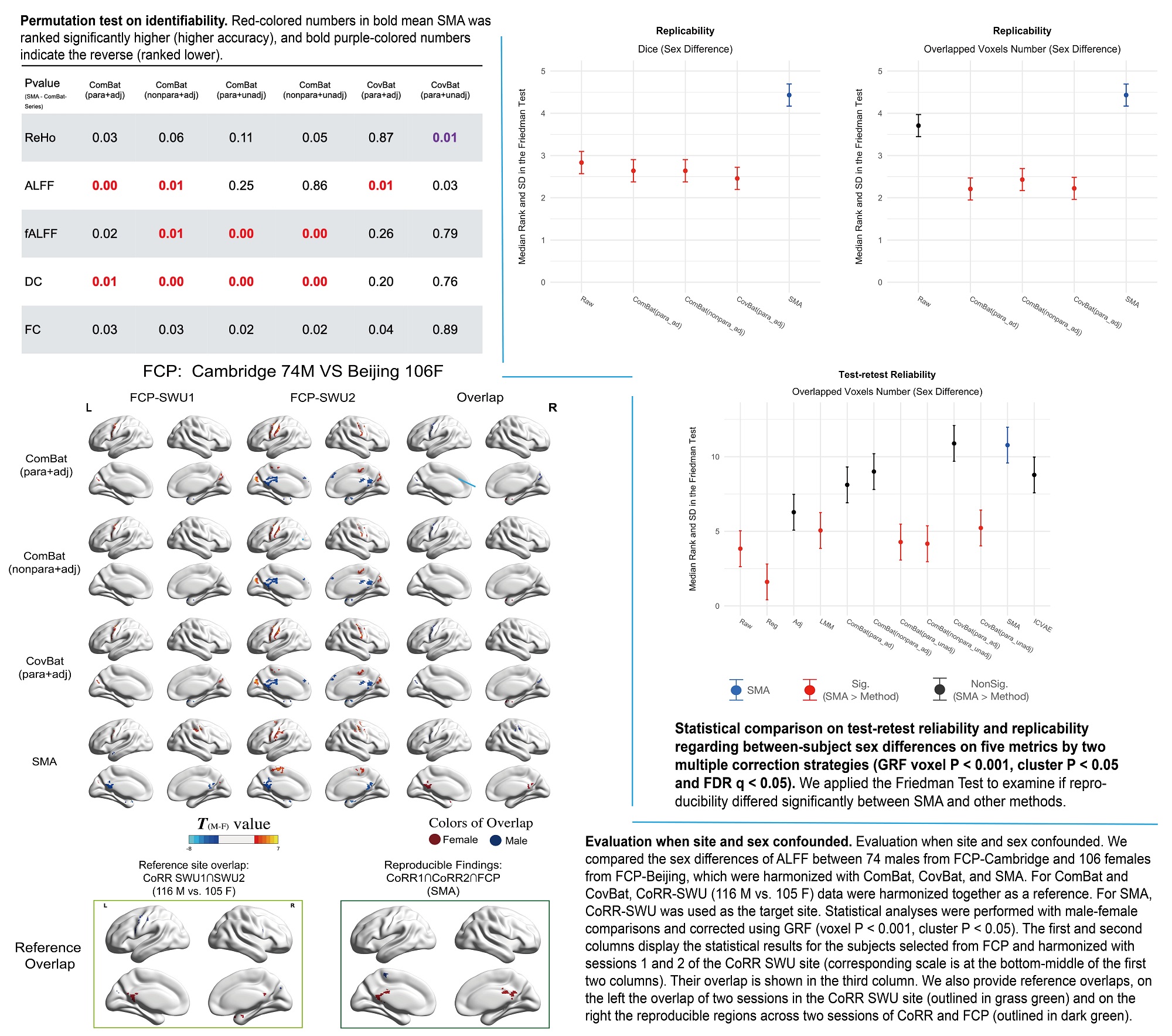 (左上角)个体识别正确率:SMA和ComBat、CovBat方法两两进行统计检验。标红数字表示SMA校正后的个体识别正确率显著高于该方法校正后的个体识别正确率,紫色反之。(右侧)性别统计结果的重测信度和可重复性:对SMA和其他方法进行统计比较,红色标注出的方法在量化的评估指标上显著低于SMA,黑色则表示无统计学差异。(左下角)性别和站点完全混淆的极端情况:研究者比较了来自 FCP-Cambridge 的 74 名男性和来自 FCP-Beijing 的 106 名女性的 ALFF 性别差异,CoRR-SWU站点的重测数据协助ComBat、CovBat 和 SMA 方法进行校正。前两列对应CoRR-SWU两次重测数据分别协助校正后的性别统计差异,第三列是前两列重叠的结果,将第三列结果与可复制的性别统计差异(右下角,深绿色框)结果进行对比。同时给出了CoRR-SWU两次重测数据性别差异的可复现结果(左下角,亮绿色框)