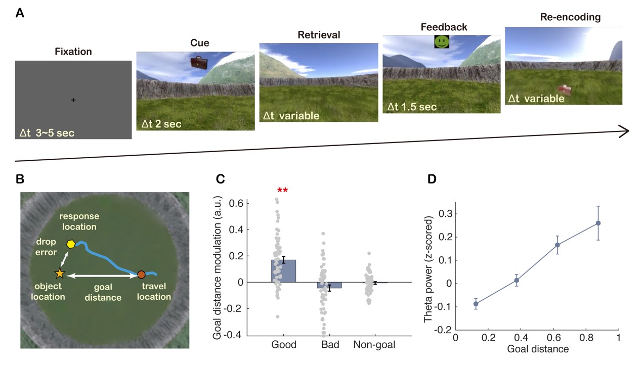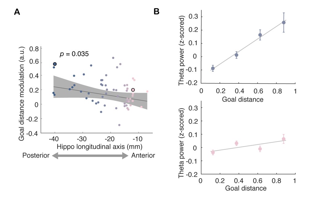 此次研究探索了人类目标距离多尺度编码的神经机制。研究者招募在双侧海马脑区植入深部电极的癫痫患者完成空间导航任务,并同步采集颅内脑电信号(intracranial EEG),研究发现右侧海马的高频theta活动 (6-9 Hz)强度显著受目标距离调制:距离目标越远,海马高频theta活动越强(图1)。