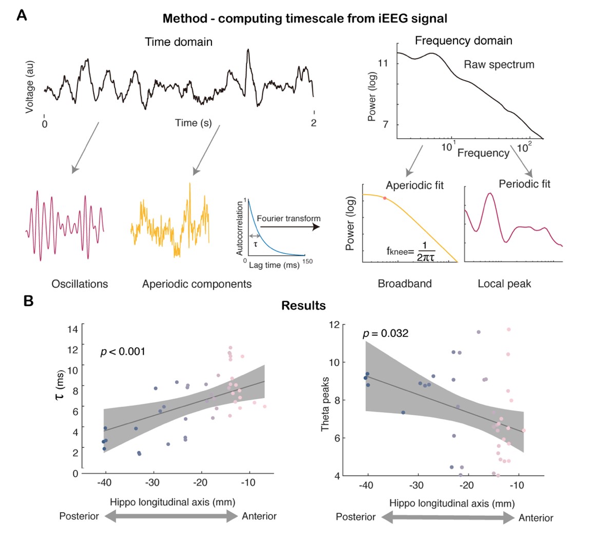 A.计算时间层次结构的两种互补方法:宽带特征(神经时间常数,即 τ)和来自功率谱密度的局部峰值,这二者分别对应于局部场电位的非周期性和周期性分量。 振荡频率更低有利于整合更多信息,因此时间层级性更高;