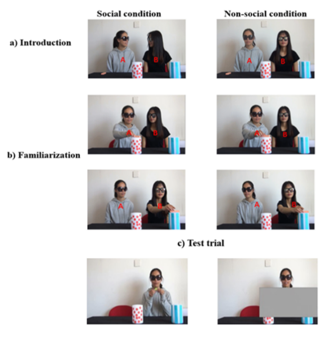 研究人员给儿童呈现社会场景和非社会场景的视频,并记录儿童观看两种视频时的眼动情况。视频有三个阶段:引入阶段、熟悉阶段和测试阶段(图1)。引入阶段和熟悉阶段的视频分为社会条件和非社会条件。两种条件下的测试视频相同。在引入阶段中,两个表演者会看向对方并微笑,进行简短的对话(社会条件)或彼此之间没有眼神和言语交流(非社会条件)。熟悉阶段中,演员们会演示三次玩积木的过程。在非社会条件中,两个演员平行活动,她们有各自的目标,演员A把积木放在中间的圆台上,演员B放在右边的圆台上。在社会条件中,两个演员有联合目标,她们的目标是把积木放在右边的圆台上。在接下来的视频中,儿童会看到演员B离开,演员A坐在了演员B的位置上。在测试阶段的视频中,演员A从桌子下面拿出一块积木,然后对着镜头说:“我又找到了一块积木。我应该把它放在哪里呢?”此时,视频中会出现一块挡板遮住演员A放积木的过程。