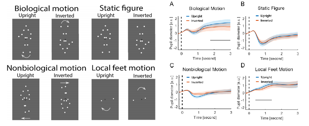 研究者使用瞳孔测量技术记录了人们分别观看正立和倒立的生物运动时的瞳孔反应。实验一结果表明,当观察者观看正立的生物运动,相比于倒立的生物运动时,其瞳孔会明显放大(图1)。实验二和实验三进一步探索了感知静止人物形态和非生物运动(去除了运动的加速度信息)的瞳孔反应,结果发现这两种条件均无法诱发更强的瞳孔扩张,这也证明了当前瞳孔放大效应与生物运动的动态特征密切相关。实验四则进一步探索了局部生物运动信号(即双脚),结果发现双脚生物运动也能诱发更强的瞳孔反应。