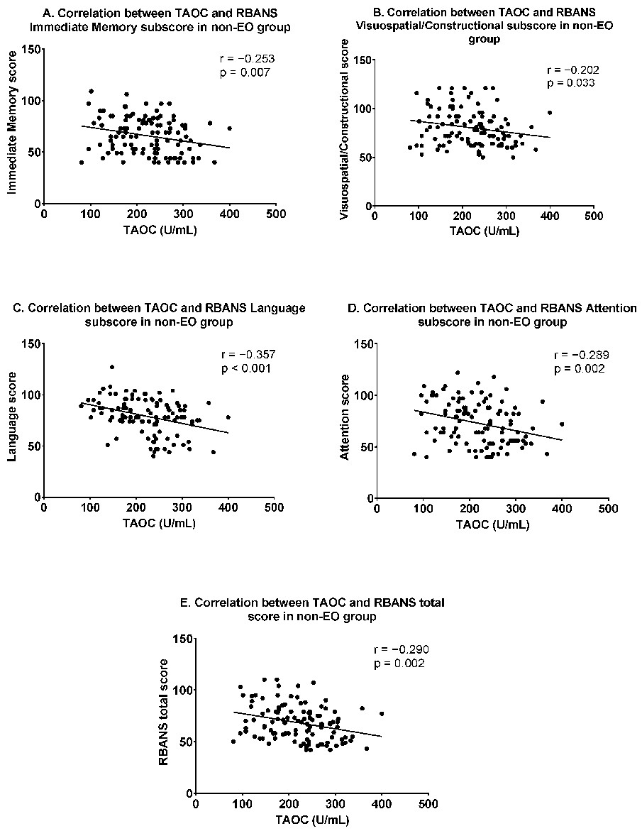 图1. 非早发精神分裂症患者总抗氧化力与认知障碍的关系