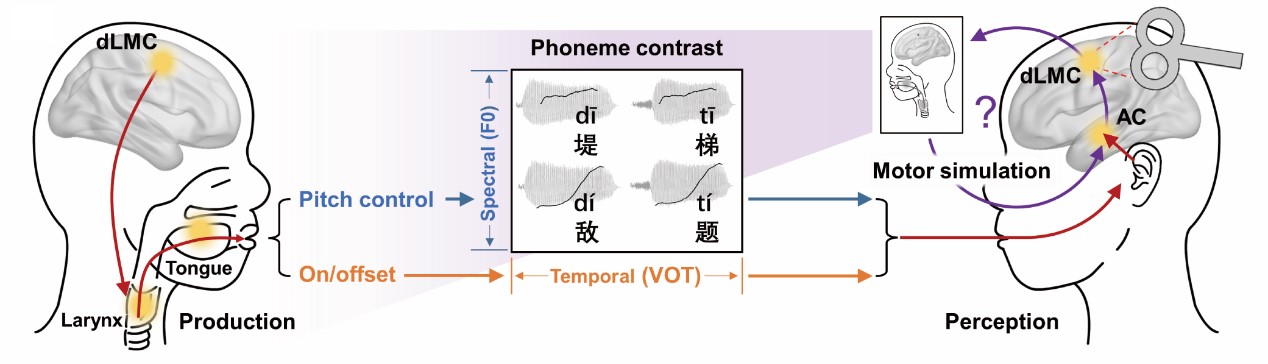 图2: 喉部运动区参与普通话言语知觉及研究方案示意图