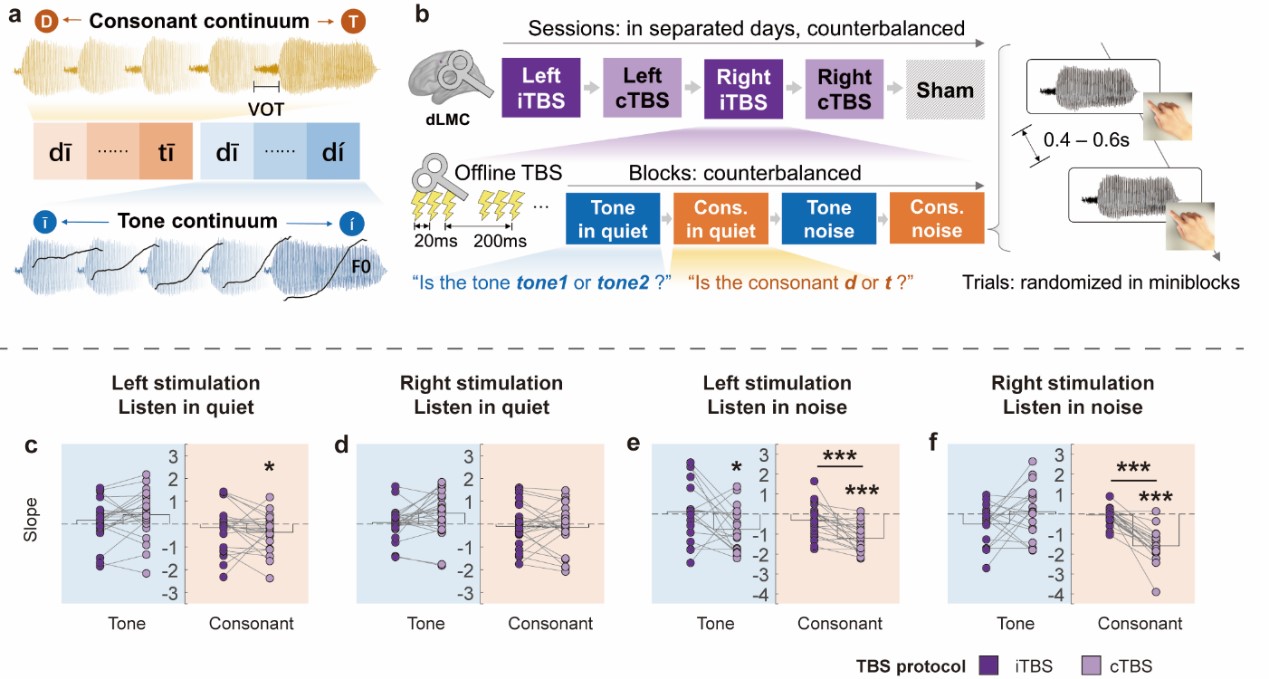 接着,研究招募了90名健康成年汉语普通话母语志愿者,并采用经颅磁刺激技术(transcranial magnetic stimulation,TMS)对其运动皮层的喉部或舌部控制区域的活动进行干预,以观察志愿者在音节分辨任务中的成绩变化。TMS是一门对人体无伤害的神经调控技术,通过变化磁场诱发颅内感应电流以暂时兴奋或抑制特定的大脑皮层区域,以短暂地改变认知加工方式。科学家们运用TMS这一特性来探究特定脑区在认知过程中的“因果性”:如果脑区在某项认知功能中具有关键的意义,那么对它的活动进行调节会引起认知和行为的改变。具体而言,研究对志愿者的左/右运动皮层进行了重复性TMS(rTMS,实验1,探索性实验)或theta爆发式脉冲刺激(TBS,实验2,正式实验),以研究在有/无背景噪声掩蔽下的声调和d/t声母的范畴知觉决策是否会受到相应的影响。