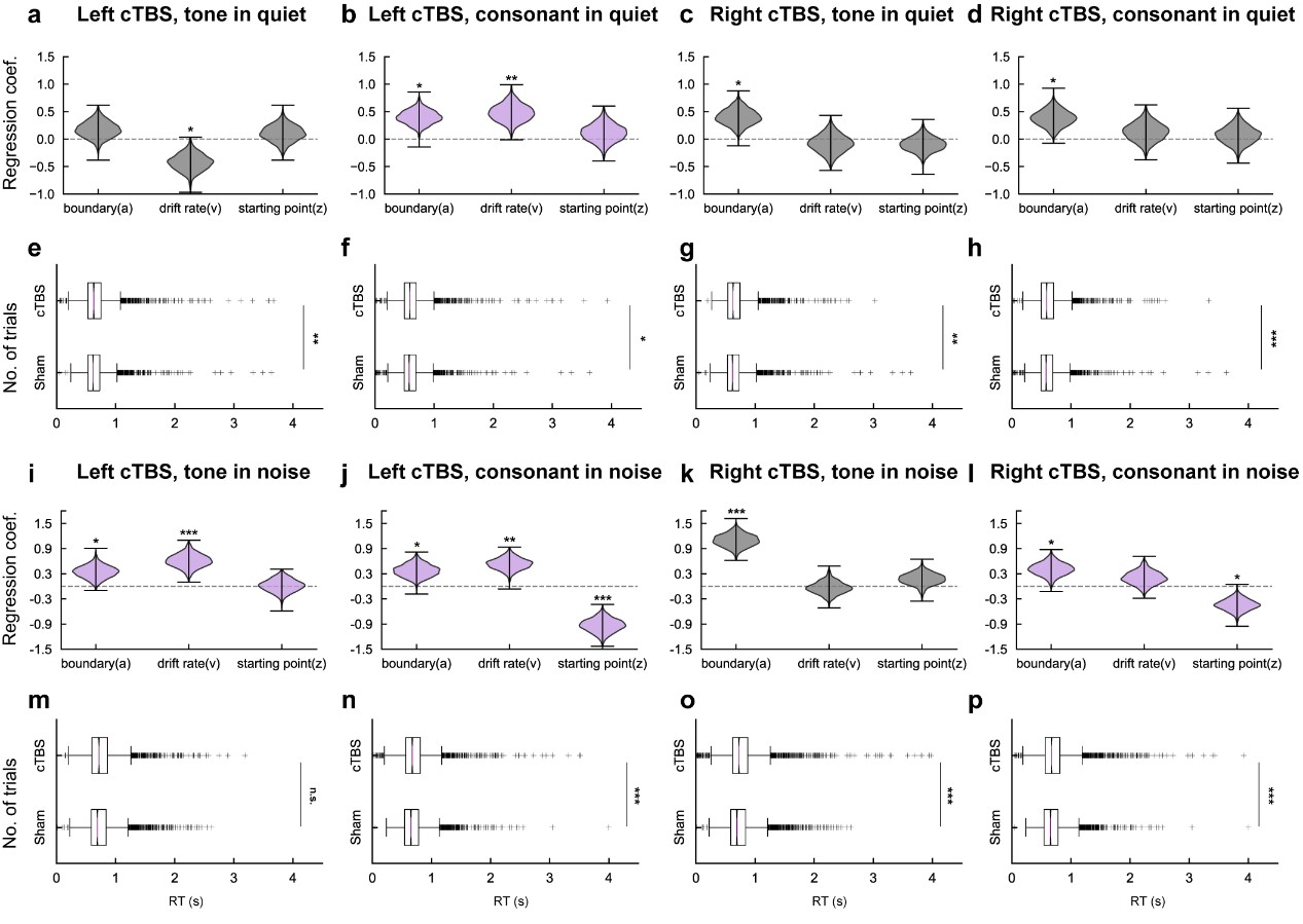 在数据分析上,本研究应用了两个独立的分析流程来研究实验二中TBS刺激喉部运动区对志愿者的行为结果的调控效应:1)通过心理物理曲线拟合探究知觉敏感性的变化(图3);2)使用层级漂移扩散模型(HDDM)分析知觉决策受影响的阶段(图4)。