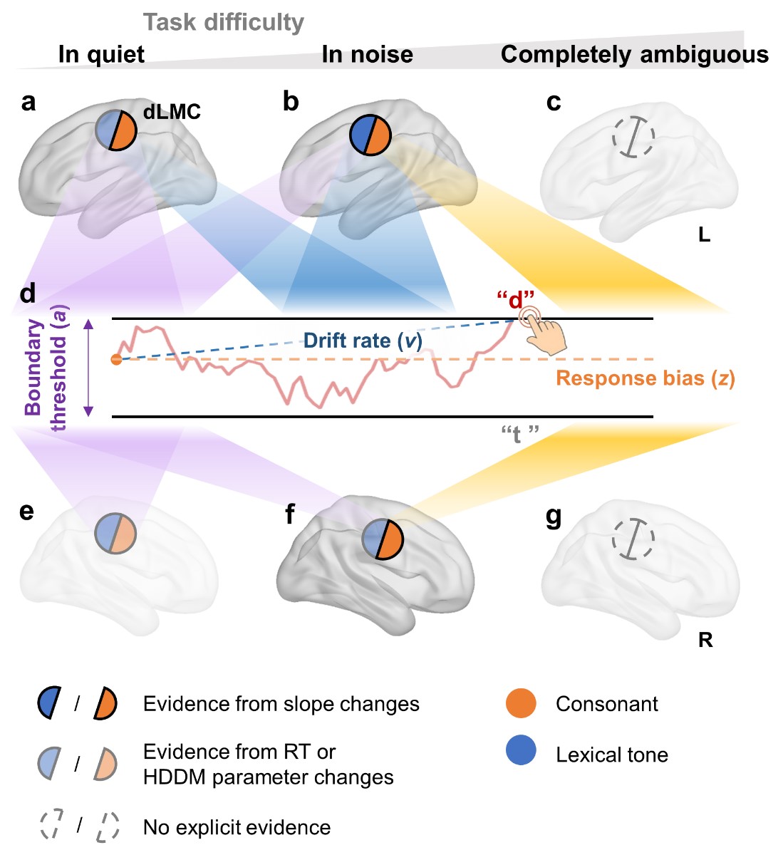 另一方面,与唇部和舌部运动控制相似,运动皮层中也存在“喉部运动区”以控制喉部的运动,从而使得人能在言语交流中能自如地控制发音和不发音,以及音高的高低变化。这两者不仅是人类得以表达言语的基础能力,更对一些辅音(如普通话声母d和t,两者的区别在于嗓音起始时间长短,即发音的时间点)和声调(如普通话的一声和二声,两者在音高变化上不一致)的发音至关重要。然而,喉部运动区是否以及如何参与言语知觉的问题一直悬而未决:科学家们尚不清楚,喉部区是否与唇舌部运动区一样“效应器特异”地参与知觉,左右侧喉部区如何在不同任务难度中进行协同,以及该区域参与了言语知觉决策(即对音节的分辨)的哪些具体过程。