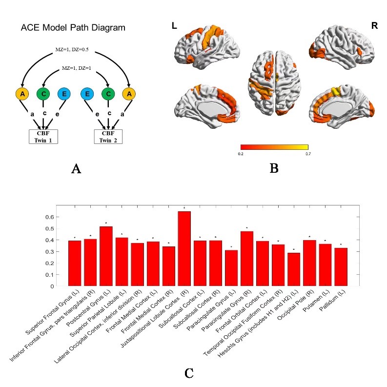 A:ACE 模型示意图;B:CBF有显著遗传贡献的脑区分布;C:各脑区CBF的遗传贡献程度