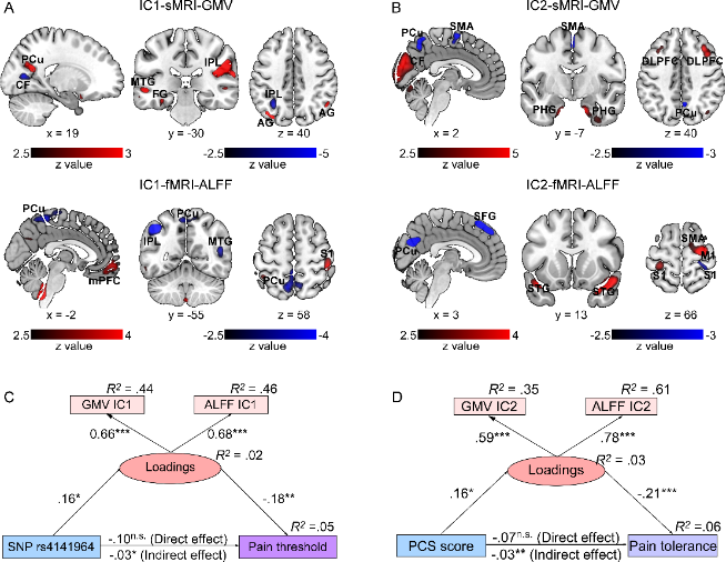 图1. IC1 (A)和IC2 (B)的脑图以及两者分别在SNP rs4141964与疼痛阈限(C)和疼痛灾难化与疼痛耐受阈限(D)关系中的中介作用