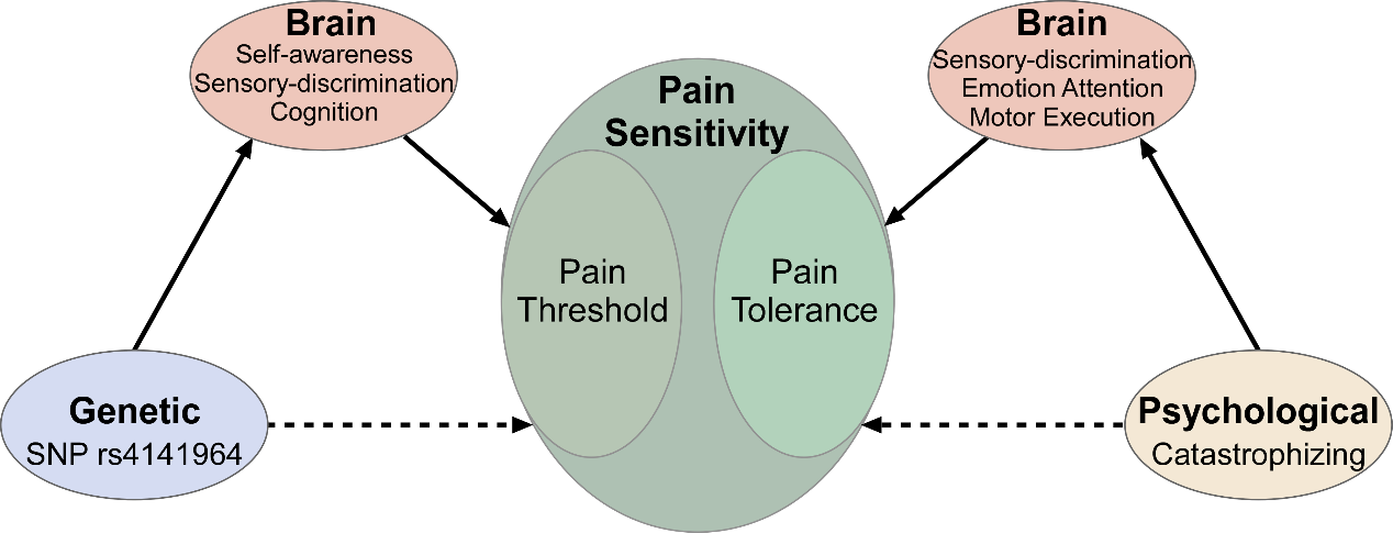 图2. 大脑-基因-心理相互作用解释个体间疼痛敏感性机制的模型
