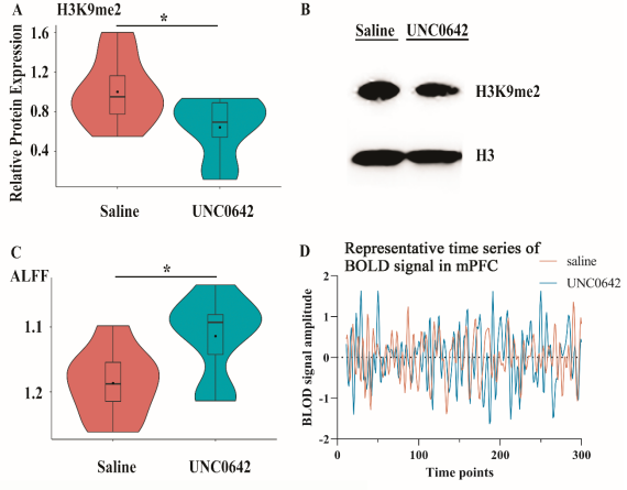 图3.特异性H3K9m2抑制剂UNC0642降低健康小鼠mPFC的H3K9me2水平并导致该脑区ALFF水平的升高
